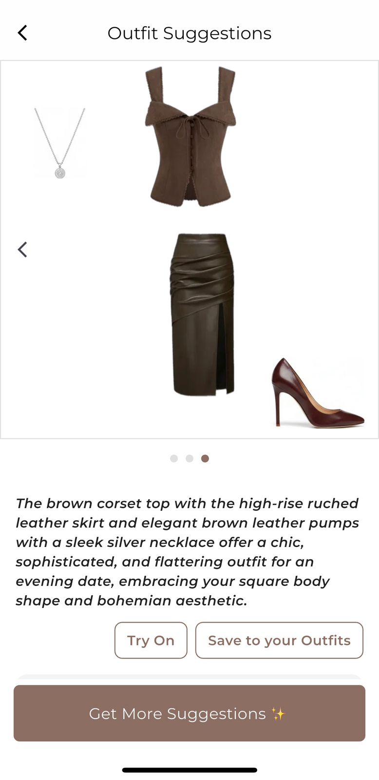 Browse AI-generated outfits, save your favorites, and discover new ways to style clothes you forgot you had. Filter by occasion — casual, work, date night, or special events.